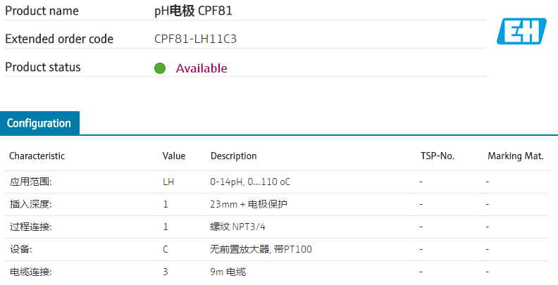 模擬式pH電極Orbipac CPF81設(shè)計(jì):緊湊型電極安裝在PPS外殼中,采用NPT3/4"過程連接。