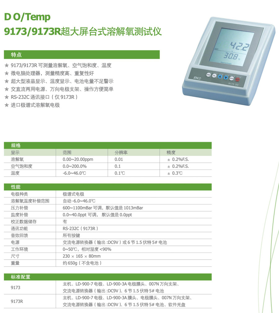 溶氧量測試儀使用特大LCD顯示面板,使用簡易。使用極譜型傳感器,可替換式膜片、可編程式壓力補償、600至1000 mBar、鹽度補償功能、0至40.0 ppt。透過雙顯示LCD熒幕顯示溶氧量、溫度,RS-232-C界面。ATC為10K熱阻器,使用電源為115/230V調配器或電池。