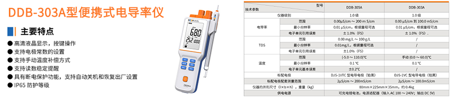 儀器級別:1.0級,測量范圍:0.00μS/cm~100.0mS/cm,最小分辨率:0.01 μS/cm,根據量程自動切換,電子單元引用誤差:± 1.0%(FS),溫度范圍:手動 (0.0~60.0)℃,標配電極:DJS-1VC型電導電極(鉑黑),標配電極配套測量范圍:2μS/cm~100.0mS/cm