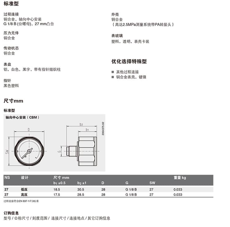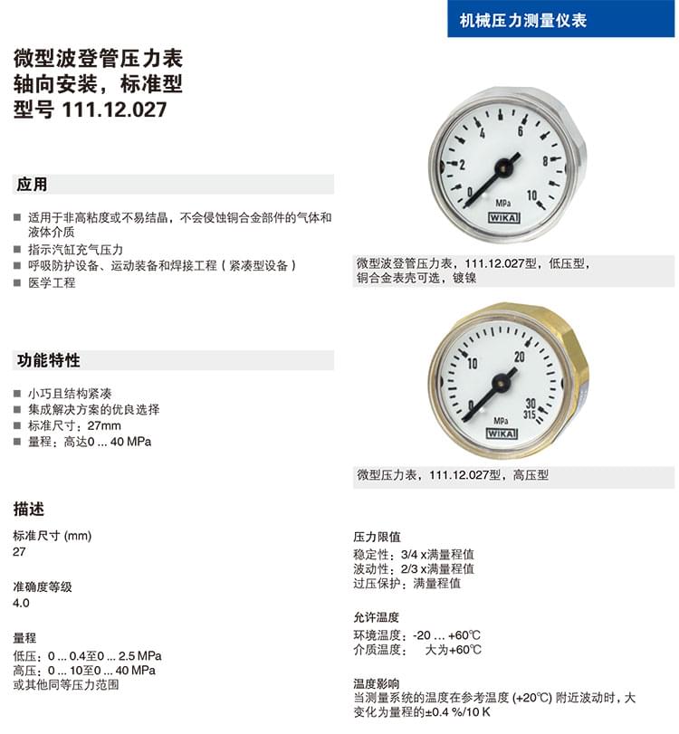 微型波登管壓力表 111.12.027型 低壓型/高壓型可選
