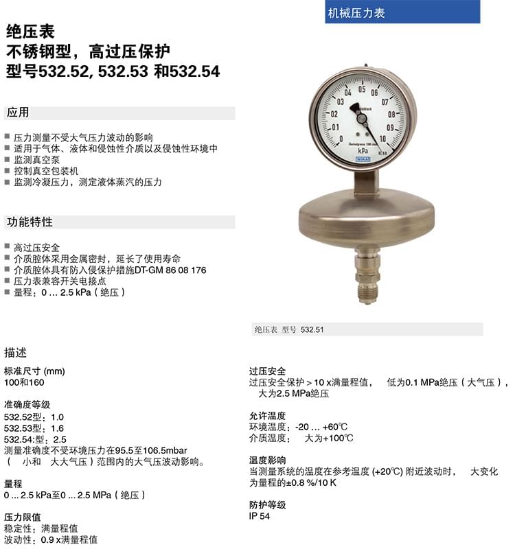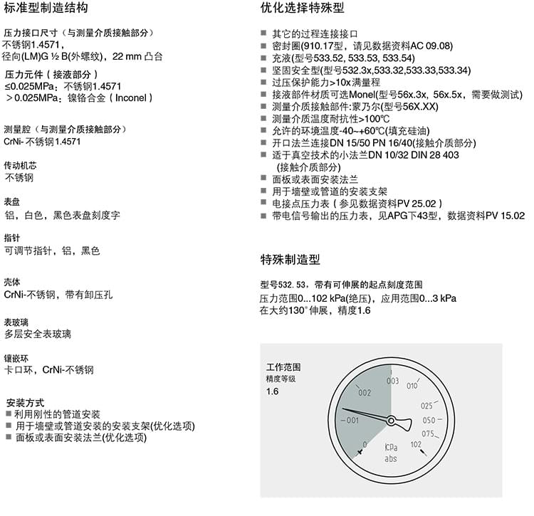 3. 絕壓表,帶有膜片,CrNi-不銹鋼制造結構壓力表:516.11 516.12 532.51 532 .52 532.53 532.54