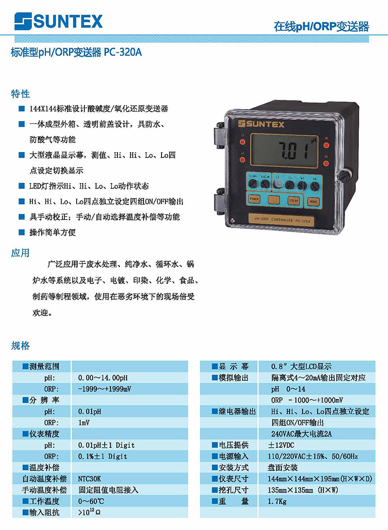 SUNTEX PC-320A標準型PH/ORP控制器 在線ph檢測儀水質監測分析儀